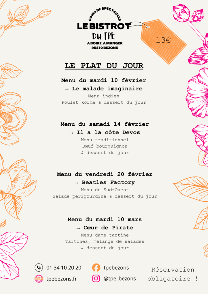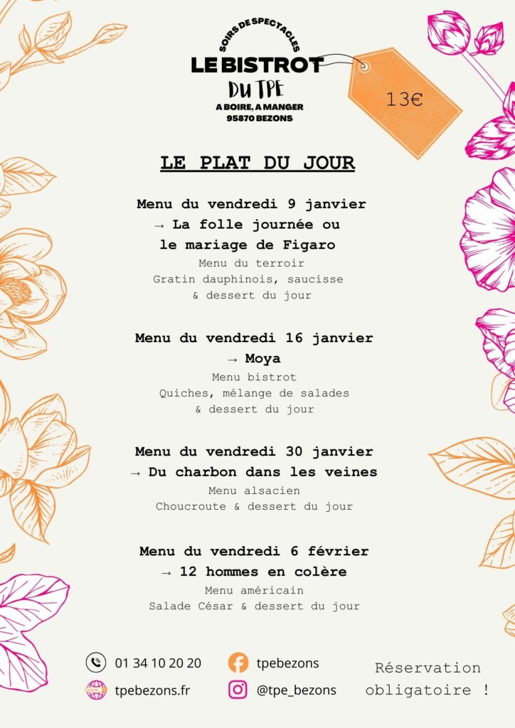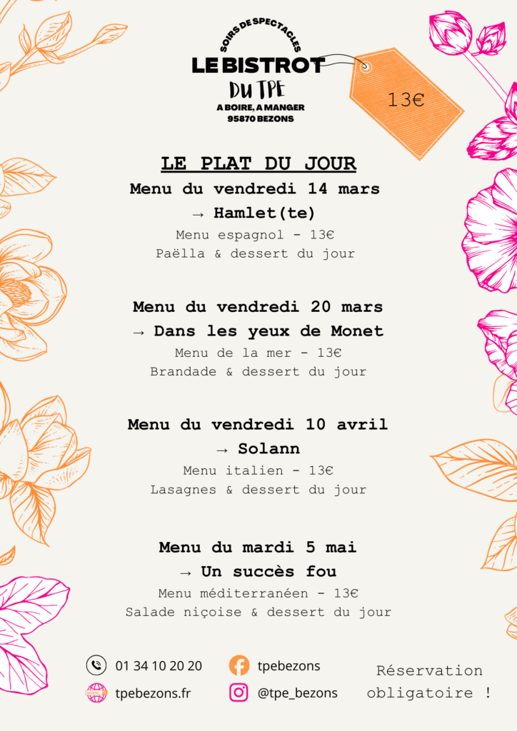 Au menu, des formules différentes à chaque spectacle, nos sandwichs et planches de fromages et mixtes. Toute l’équipe du TPE est là pour répondre a vos questions, vous conseiller sur les spectacles et imaginer avec vous des projets artistiques.